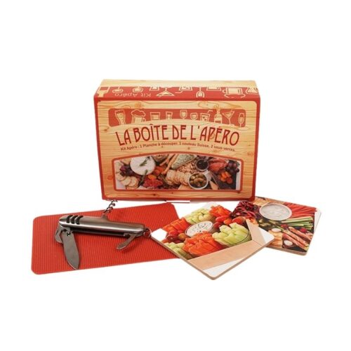 - Le kit apéro : idéal pour créer un moment convivial dès l’arrivée. Il comprend : 1 planche à découper 16×11 cm, 1 couteau suisse et deux-verres 9x9cm
